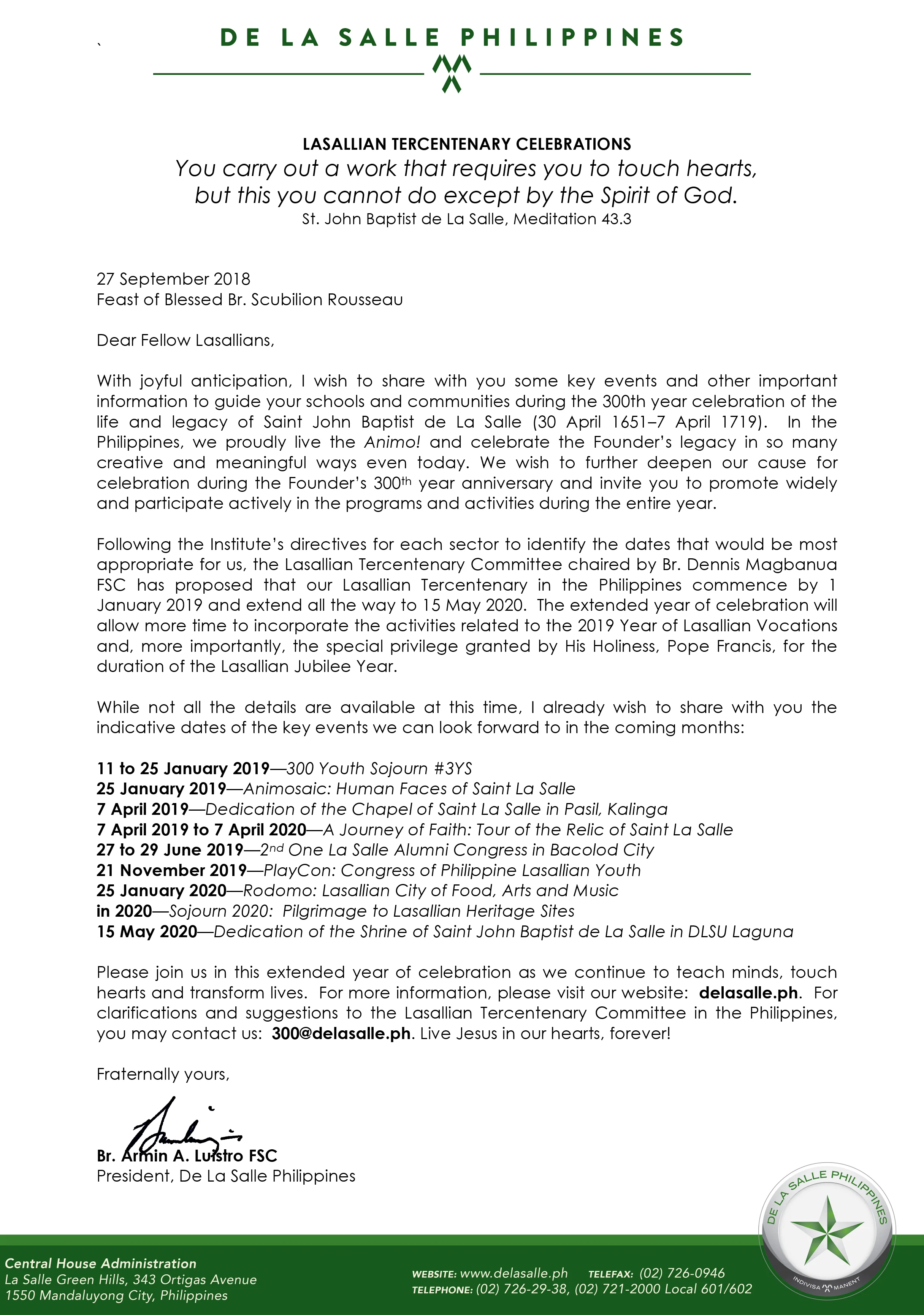 Follow the De La Salle Philippines and De La Salle: One Heart, One Commitment, One Life on Facebook and Instagram for updates on our Tercentenary activities.