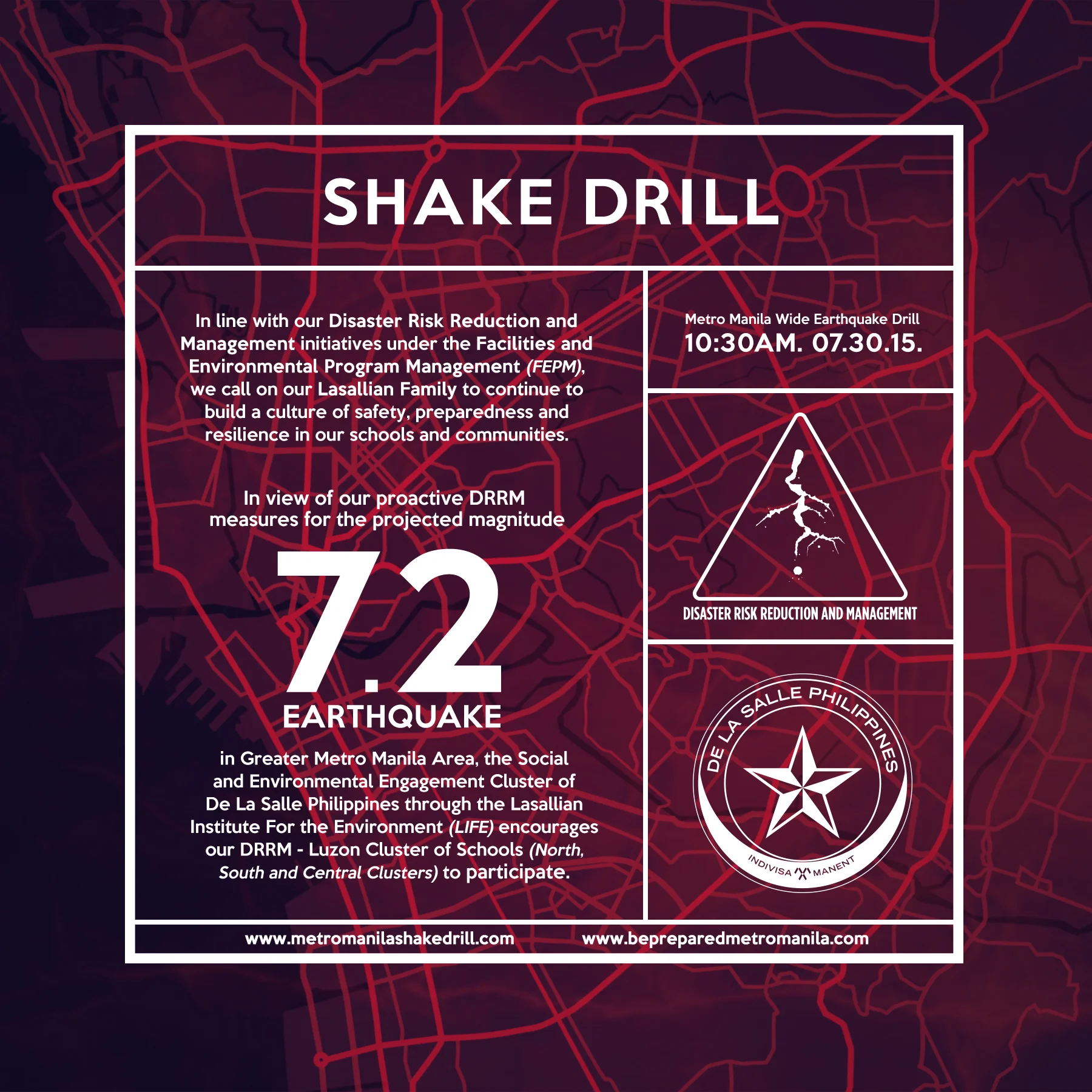 In view of our proactive DRRM-EP measures for the projected magnitude 7.2 earthquake in Greater Metro Manila Area, the Social and Environmental Engagement Cluster of De La Salle Philippines through the Lasallian Institute For the Environment (LIFE) encourages our DRRM - Luzon Cluster of Schools (North, South and Central Clusters) to participate in the Metro Manila Wide Earthquake Drill at 10:30 AM on July 30, 2015.